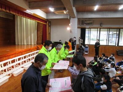 スクールガードの方への感謝集会を実施しました。今回は、お忙しい中8名の方が来校し、子どもたちが感謝の気持ちを伝えました。