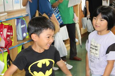 校長先生の話では、ランドセルから色々な物を出し、小学校でがんばってほしいことを伝えられました。
