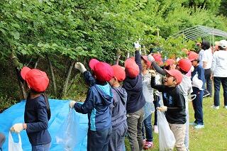 5月30日に学校の裏山にある梅の実ちぎりをしました。高い所の梅の実は、4~6年生が棒を使って落とし、3年生が拾い集めました。