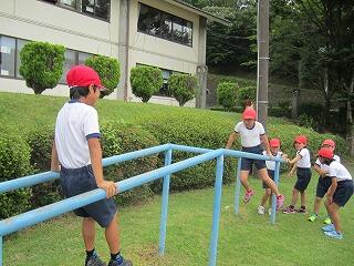 運動の内容は、①うんてい、②米俵跳び、③バトン投げ、④タイヤスラローム、⑤坂道ダッシュ、⑥両手支持わたりです。子どもたちは、毎回楽しそうに運動に取り組んでいます。