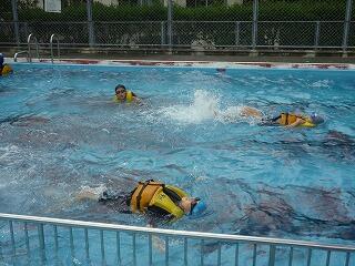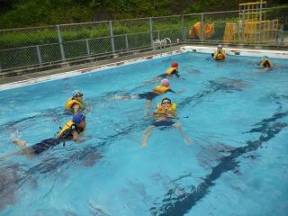 この学習は、着衣したまま水に入る体験を通して、水の中での動きにくさを体感するとともに、水の中でどう対処すればよいかについて学び、安全への意識を高めることを目的としています。子どもたちは、着衣したままで水に浮くためのさまざまな方法について学ぶことができました。
