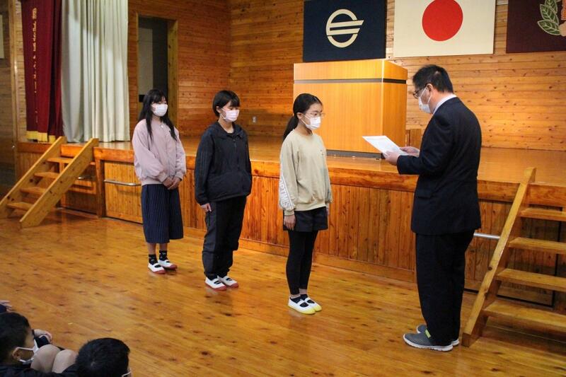 1年生3名が、給食の時間の放送で音読を発表しました。
