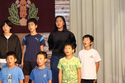 1学期最後の校歌斉唱。元気一杯の歌声がホールに響きます。