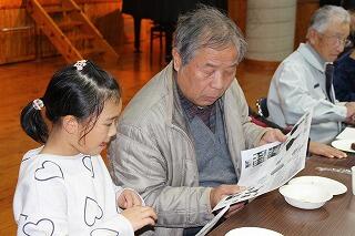 初めに、自分たちが育てた大根とレタスを使って作ったスープとお菓子を食べてもらいました。味もよくて、「おいしい、おいしい。」と言って食べてくださいました。