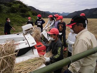 26日(金)の6校時に5・6年生が稲の脱穀を行いました。16日に稲刈りをした後、掛け干しをして乾燥させていました。