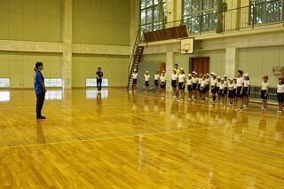 今日はあいにくの雨だったので、研修館で行いました。今日の内容は、入場行進、開会式、準備運動、全校ダンスの練習でした。今日の学習のキーワードは「覚える」でした。足踏みの仕方、止まり方、礼の仕方、体の向け方など、覚えることがたくさんありました。みんながそろうととても美しく見えます。心を1つにこれからも練習をがんばっていきましょう。