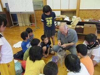 椎谷神楽の始まりや使う道具について学ぶことができました。たくさんの面を見せていただいたり、実際に太鼓をたたいたり、鈴を鳴らしたりもさせていただきました。子どもたちはどれも興味深かったようです。
