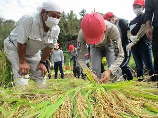 ※刈った稲は天日干しにします。稲の縛り方を指導していただきました。