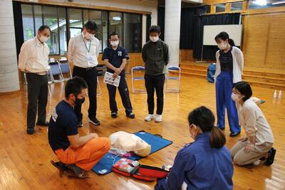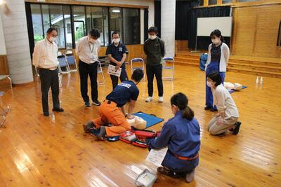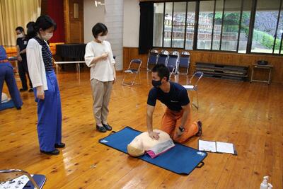 プール開きを前に、職員研修(心肺蘇生法講習)を、消防団の方を招いて実施しました。