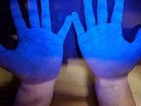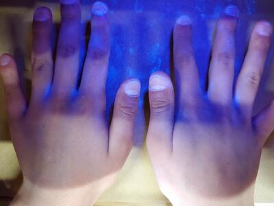 ※手洗い指導の後、実際洗ってから、また検査をしてみましょう。丁寧に洗います。