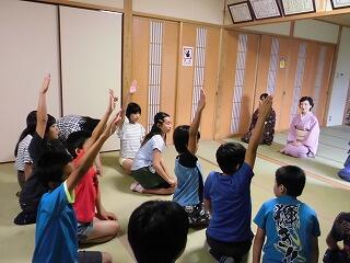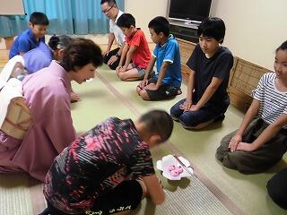 7月9日(火)に5・6年生は、茶道教室を開きました。講師に甲斐シズエ様他2名を招き、団七の館で行いました。礼の仕方や戸の開け閉めの仕方、お茶やお菓子の出し方や受け方などについて、丁寧に教えていただきました。