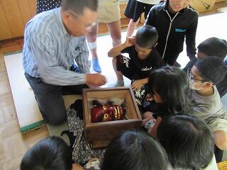 6月5日は、高巣野神楽について学習しました。今回は、高巣野公民館で会長の桐木 務さんに、高巣野神楽の始まりや内容、舞う際に使う道具などについて教えていただきました。子どもたちは興味深く話を聞いていました。