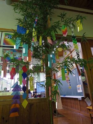 今年も、地域の方により竹の差し入れがありました。さっそく、短冊に願いを書いて、竹笹に飾り付けました。