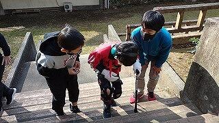 子どもたちは、装具を付けて歩いたり、階段を上り下りしたりすることで、思うように動いたり、歩いたりすることができない体験をしました。それと合わせて、困っている方にどように手をさしのべて、助けてあげればよいかを体験しました。