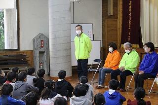 毎朝、登校するときにいっしょに歩いていただき、みんなの交通安全に気を付けてくださっています。8名の方が来校され、みんなに話をしていただきました。
