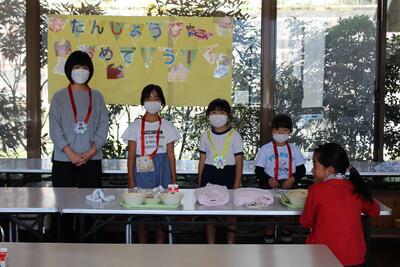給食委員会からのプレゼントをもらって、ご満悦です。みんなで、「おめでとう!!」コールをしました。