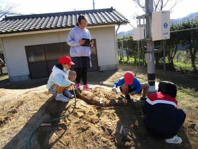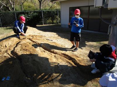 ※実際に水を流して、観察してみます。「行ったよ~(水が流れたよ~)」、撮影もしっかりと!
