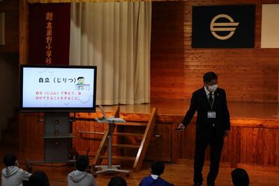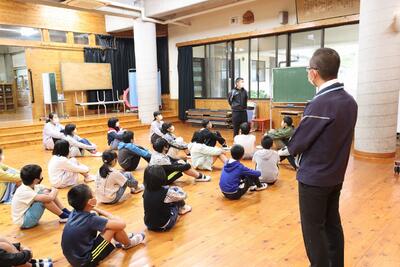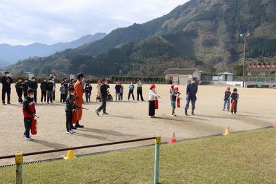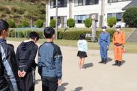 ※避難中は、どの児童も真剣に「お・は・し・も」の約束を守って、避難をしていました。避難終了後、西臼杵消防局の方より、お話がありました。