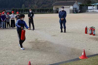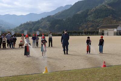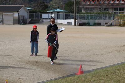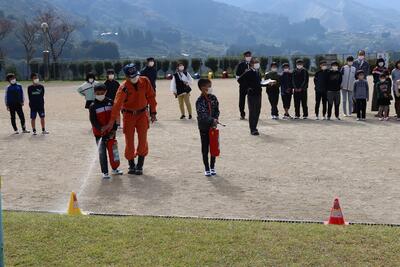 ※最後は、代表して5年生が模範演技!大きな声で「火事だー」と叫び、消火をしました。ばっちりです。