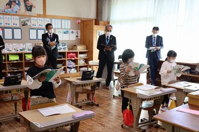 ※1年生、3人だけですが、堂々といつもどおりの学習活動ができました。いつもの場所で、いつものグループ協議です。司会も子どもたちでやります。説明は、教科書を示しながら行います。