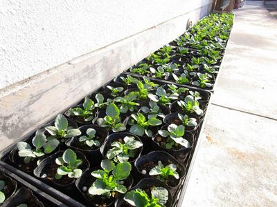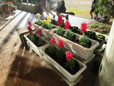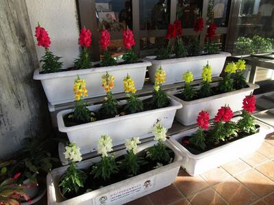 ※玄関横のランチルーム前には、卒業式・入学式に向けた花の準備が始まっています。こちらも元気に成長しています。