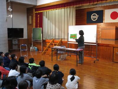 安富ゆかりさんが、来校してたくさんの本の紹介と読み聞かせを全校児童に対して、実施していただきました。45分の時間があっという間の時間に思えるほど、子ども達も引き込まれていくのがわかります。