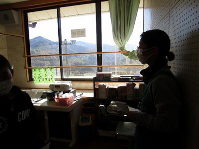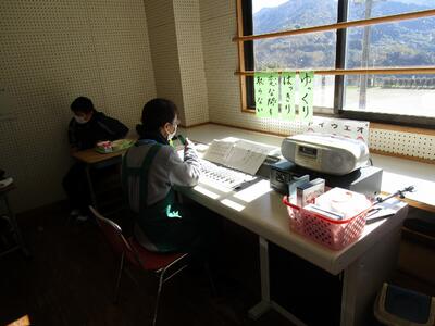 ※読み聞かせのために、放送室へ行き、スタンバイする図書活動推進員。