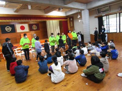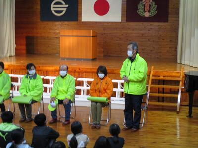 スクールガードの方への感謝集会を実施しました。今回は、お忙しい中8名の方が来校し、子どもたちが感謝の気持ちを伝えました。
