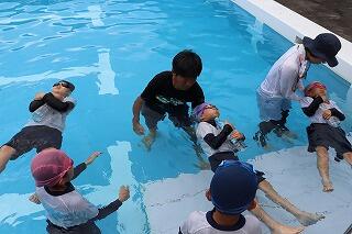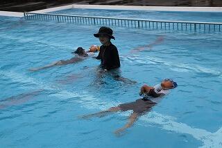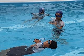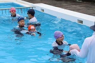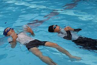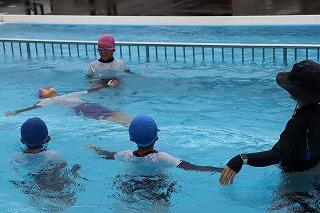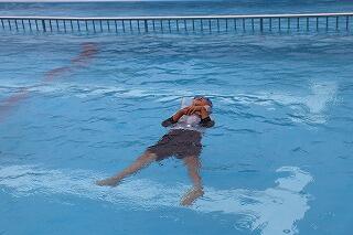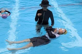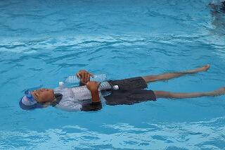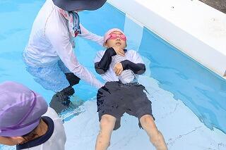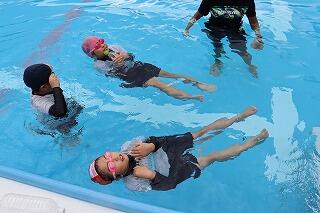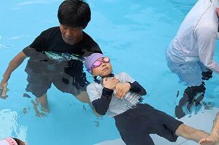 水を吸っても衣服は浮きやすく、体温低下を防ぐこともできるので、この着衣泳を体験して、いざというときに「あわてず、浮いて、待つ」ために、毎年行っています。