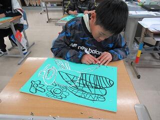 3年生にとっては初めての彫刻刀です。彫刻刀の持ち方や左手の置く場所に気を付けながら、ゆっくり丁寧に彫っていました。