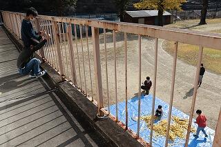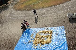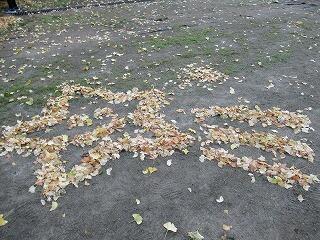 集めたイチョウの葉っぱで漢字を作り、2階のベランダから見て、当てっこをしていました。