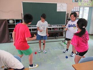 最初に、みんなで輪になってパスをしました。蹴ったり止めたりしました。変なところにボールが行ったり、空振りしたりしましたが、楽しかったです。