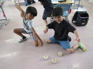 折り紙、割りばし、1円玉、10円玉、輪ゴム、おはじき等、電気を通すか通さないか予想を立ててから実験をしました。