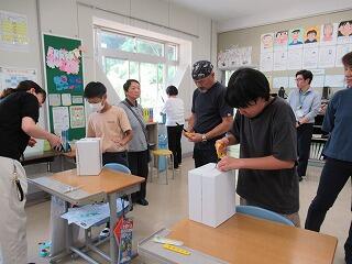 3・4年生は、図工「おもしろ段ボールボックス」という学習をしました。直方体の段ボール箱を段ボールカッターで切って、自分の作りたいものを作りました。