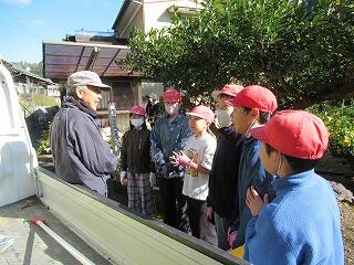 高見昭雄さんがゆずの取り方や枝の切り方を教えてくださいました。子どもたちは、高枝切りばさみや剪定ばさみを使って、慎重に慎重に収穫しました。ゆずのよい香りがあたり一面に広がりました。