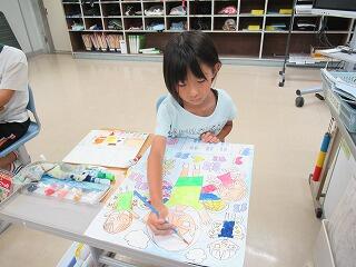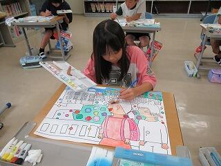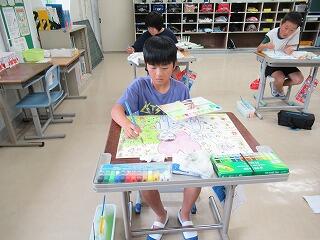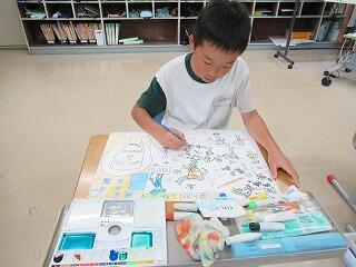 今日の2時間目、3・4年生は、水彩絵の具を使って色塗りをしました。