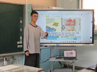 10月2日(木)、5年生は、道案内の学習をしました。「まっすぐ進みなさい」「左に曲がりなさい」「止まりなさい」などを英語で覚えて、道案内ができるようになりました。