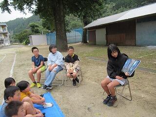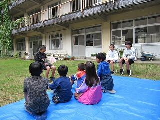 いつもの読み聞かせと違って、運動場や中庭など、外で読み聞かせをします。