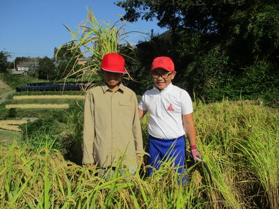 5,6年生9名のうち稲刈り初体験者は、たった1名。