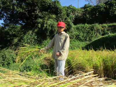 秋晴れのもと、古園地区にお住まいの岩本尚格さんの田んぼをお借りして稲刈りをさせていただきました。