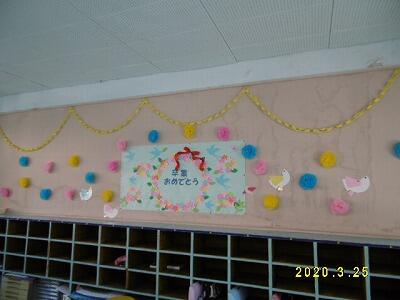 まずは、5・6年生教室に入ってビックリ!完成度の高い巨大黒板アートや臨時休業中に職員が作成した掲示物が卒業生を迎えました。