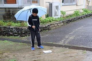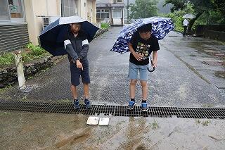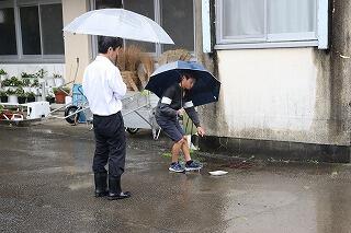 「なぜ水は地面を流れるのかな」「流れた水はどこへ行くのかな」という問いを解明するために、教頭先生と一緒に雨の校庭に出て実験をしました。