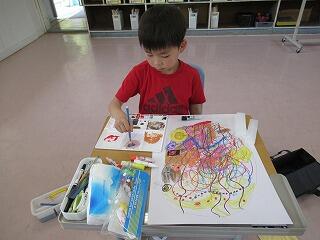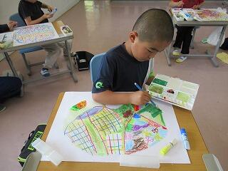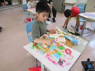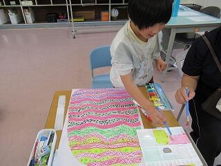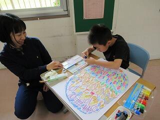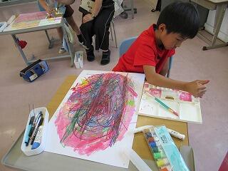 2年生は図工の時間でした。大きな画用紙に大きな卵の絵をかいていました。画用紙からはみ出すぐらい大きく、個性的な卵ができました。
