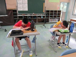 3・4年生は、いつも通り集中して複式授業を受けていました。算数の学習でした。プリントをしたり、筆算の仕方を考えたりしていました。↓↓↓