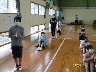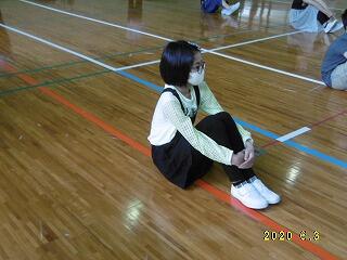 【体育館に移動し、不審者対応の合言葉「イカのおすし」の確認】