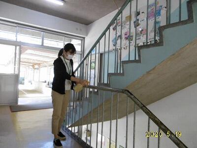 朝の光景です。児童が安全に学校生活が送れるように、よく使う物を奥原先生が消毒してくれていました。