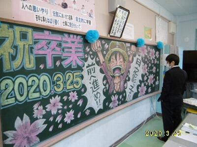 まずは、5・6年生教室に入ってビックリ!完成度の高い巨大黒板アートや臨時休業中に職員が作成した掲示物が卒業生を迎えました。