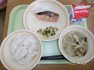【麦ご飯、焼き魚の塩焼き、高菜炒め、味噌汁、牛乳(当時は脱脂粉乳)】