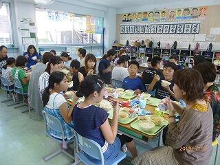 19名の保護者の方々に、児童と一緒に給食を食べていただきました。