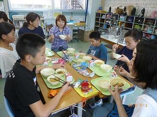 19名の保護者の方々に、児童と一緒に給食を食べていただきました。
